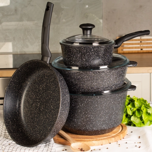 Серия исполнена в черном цвете в крапинку. Литой корпус изготовленный из пищевого алюминия, исключающий деформацию посуды во время использования. Трехслойное антипригарное покрытие Greblon C3. Эргономичные бакелитовые ручки с покрытием Soft-Touch. Дно проточено и окрашено, что позволяет не царапать стеклокерамику.