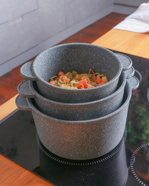 Посуда из серии "Granito", изготовлена из пищевого литого алюминия исключающего деформацию посуды во время использования. Качественное, многослойное антипригарное покрытие на водной основе Pfluon Coocmark. Антипригарное покрытие наносится как на внутреннюю, так и на наружную поверхность посуды что увеличивает срок службы изделия. Утолщенные стенки и дно обеспечивают равномерное распределение и сохранение тепла. Дно рифленое, без покрытия.